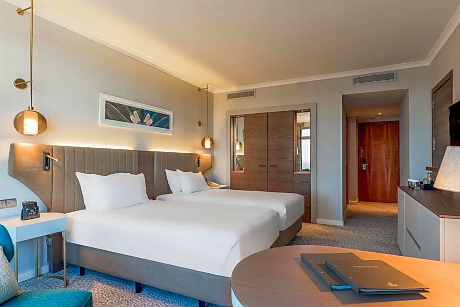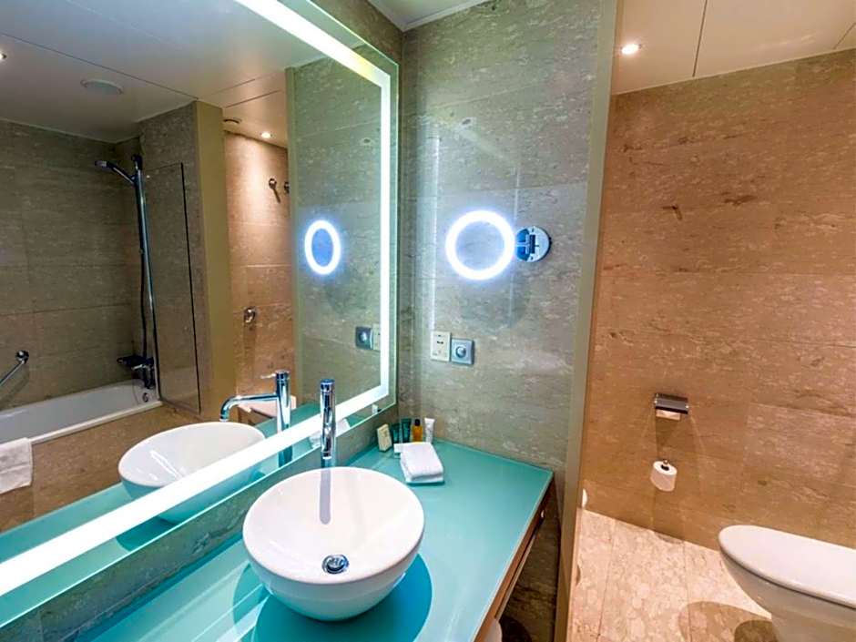 Executive benefits, desk with ergonomic chair, fridge. Enjoy this bright space with two comfortable single beds and stunning decor that emulates the relaxed Mediterranean lifestyle. A well-equipped desk, natural light, and air conditioning mean you can work in comfort. Also included with this airy room are a 42-inch HDTV, iron and ironing board, an elegant bathroom with shower, and a fluffy bathrobe.