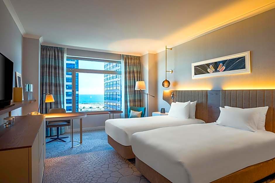 Desk with ergonomic chair, fridge. Experience the essence of Barcelona culture in a spacious Twin Guest Room with two comfortable single beds and decor that emulates the relaxed Mediterranean lifestyle. If you're traveling on business, the well-equipped desk, natural light, and air conditioning will help you work in comfort. A 42-inch HDTV, iron and ironing board and an elegant bathroom with shower or bathtub complete this inspirational room.